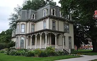 Edward Harrison House, also known as Brockport Alumni House, is a historic home located at Brockport, Monroe County, New York. It was built in 1877, and is a three-story, Second Empire style frame dwelling with a two-story rear wing. It features a steeply pitched mansard roof with segmental arch dormers and a front porch with decorative brackets. The house was renovated about 1900, and some Colonial Revival style design elements were added to the interior. The house was sold to the State of New York in 1898, and has been used for various purposes by the State University of New York at Brockport and its predecessors.[2]: 5, 7