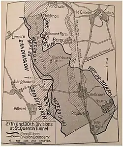 After its preliminary training the Division entered the line on July 16, where it remained almost continuously until the end of October. In that time it was in the actual battle from 30 August, and took part in the Ypres-Lys and Somme offensives. On September 29, the Division broke through both the Hindenburg and the Le Catlet-Nauroy lines, capturing Bellicourt and Nauroy, an operation on which all subsequent action of the 4th British Army depended. From October 7 to October 20, the Division advanced 23 kilometers in a continued series of attacks, capturing 2,352 of the enemy. Brancourt, Premont, Busigny, St. Benin, St. Couplet and Escaufort, La Haie Mineresse, and Vaux Andigny are names which will live in the memories of those who fought in the 30th Division. But its especial glory will always be the honor you won by breaking the Hindenburg Line on September 29. Such a record is one of which we are all proud.
