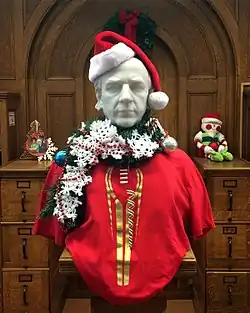 A bust of Edward Orton Sr. in the Orton Hall library at the Ohio State University, decorated to celebrate Christmas and the school football team's participation in the College Football Playoff