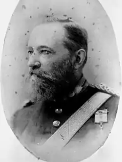On the following day (4 February 1896), his body was carried on a special train from Sandgate railway station to Brisbane's Central railway station where a full military guard waited. The streets were lined with spectators; indeed, the police had difficult keeping order at the railway station due to the extent of public interest. The military procession then slow-marched from the railway station through the streets of the Brisbane CBD to the Toowong Cemetery where he was interred. The procession was led by many branches of the defence forces, followed by his coffin on a gun carriage and his riderless war horse, after which came the carriages of the many mourners accompanied by military bands playing solemn tunes.[5][6]