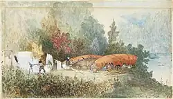 In England, he participated in the important Burlington Gallery Colonial and Indian Exhibition in 1886, exhibiting 49 or 50 oil and watercolour works in the Australian section of the show.[3][2] He seems to have produced replicas of his work for many years so that many of the Australian subjects were from an earlier trip to Australia.[2] Roper also organized another major exhibition of colonial pictures in 1889, and lectured widely about colonial life. He was elected a member of the Royal Geographical Society in 1889[3] where he was recorded as an artist living in Staplehurst, Kent. He remained a member until 1902, living at Bexhill-on-Sea in 1898, then at Lewes. He died in 1909.[2]