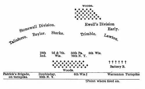 After Stonewall Jackson successfully maneuvered around the flank of the Union army, the order was given to fall back to Centreville, Virginia, in an attempt to surround Jackson's Corps. On the evening of August 28, while marching northeast with three other brigades on the Warrenton Turnpike, the Iron Brigade encountered Jackson's Corps near Gainesville, Virginia.[3]: 446 General Irvin McDowell, who commanded their Division, was convinced that the Confederates represented an inconsequential force, and ordered the brigades to proceed on their march toward Centreville.[6]: 62 [note 4]