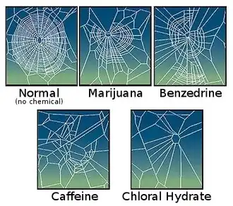 Drugs administered to a spider affect its ability to build a web.[6] Webs produced under the influence of small doses of LSD (omitted in this image) show increased regularity.[7]