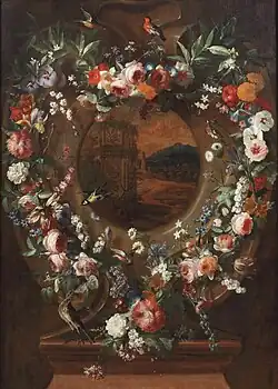 - ^ Egidus Nuemans, A stone cartouche surrounded by garlands of pink roses, tulips, poppies and other flowers and birds with an Italianate landscape in the centre at Christie's