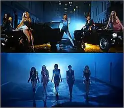 A frame of the Saturdays in the music video for "Ego", showing their superhero outfits.