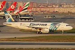 The aircraft involved, manufactured in 2003, was an Airbus A320-232,[b] registered as SU-GCC with serial number 2088. It was equipped with two IAE V2527-A5 engines.[4][5]: 45–46 The Airbus A320, introduced in 1988, is a twin-engine aircraft that can seat up to 180 passengers in a high-density layout, although it typically seats 150 passengers, and has a range of up to 6,480 kilometres (3,500 nmi). The aircraft involved was delivered new to Egyptair in November 2003,[6] and had logged 48,052 flight hours in 20,773 flight cycles since its manufacture.[5]: 45