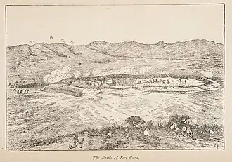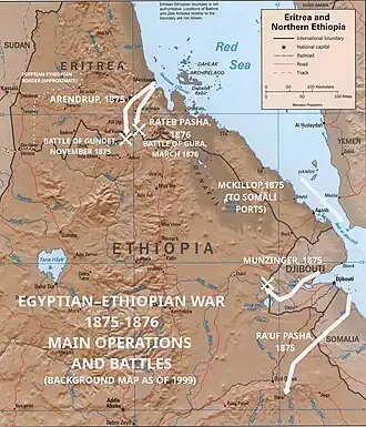 Several European officers served on both sides of the conflict at various capacities; these include a British adventurer John Kirkham on the Ethiopian side, and the Dane Adolph Arendrup as well as Swiss explorer Werner Munzinger on the Egyptian side.[12][13] Munzinger, former governor of the Keren and Massawa regions, led one of the Egyptian attacks against Ethiopia, marching inland from Tadjoura, but his troops were overwhelmed by the army of Muhammad ibn Hanfadhe, Sultan of Aussa, and he was killed in battle.[14][9] Meanwhile, Arendrup, who was Isma'il's aide-de-camp was given the task of leading an expedition against the Abyssinians. In mid-November during clashes at Gundet, Arendrup, several other officers and about 1,000 privates died during a 12-hour battle. Only three men escaped alive.
