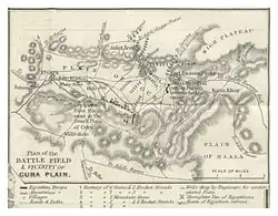 Following the unsuccessful invasion, the khedivate army again attempted another invasion, this time with an army of about 13,000 men. The forces of Isma'il Pasha, now under Ratib Pasha, arrived at Massawa on 14 December 1875.[12] By March, they had reached the plain of Gura and set up two forts, one in the Plains of Gura and the other at the Khaya Khor mountain pass a few kilometers away. Yohannes had once again mobilized, this time presenting the issue as a struggle between Christianity and Islam, thousands of men answered with soldiers coming as far as Gojjam, although Menelik’s soldiers in Shewa remained as observers. The Ethiopians, now with a force of some 50,000 (of whom only about 15,000 could fight at one time due to battlefield layout), engaged them on the 7 March 1875, and Ratib Pasha ordered just over 5,000 out of 7,500 men stationed at Fort Gura to leave the fort and engage the Ethiopians.[2] This force was quickly surrounded by the Ethiopian advance guard, probably commanded by Ras Alula, and quickly broke. The Ethiopians then fell back, and, on 10 March, mounted a secondary attack on Fort Gura, which was repelled. The Ethiopian force dissolved the next day, and the khedivate army soon withdrew.[7][1]