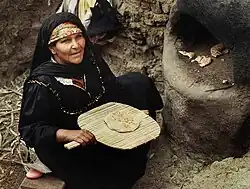 Egyptian women's cultural dress is subject to more regional variation than men's. It has three major elements common across the country; a basic dress, an outer modesty garment, and a head covering. The many layers provide modesty, material that can be picked up and folded to carry things in, and protection for dirt, lice, and scratches from plants. Many dresses also have side slits or lower necklines to enable breastfeeding. The looseness of the garments promotes airflow, and the dark color of the outer garments has a negligible increase in heat while worn.[38] Women's dresses are also called galabiya. Dress in the Delta is usually loose with a yoke, but in Middle Upper Egypt women's dresses are typically waisted. Deep Upper Egyptian dresses may be loose or waisted depending on ethnicity. In the Delta, women's dress is distinguished from different parts of it by decorations. Upper Egyptian women are usually differentiated by their modesty covers, which tend to be distinctive. However, headscarf styles now vary so much that this is not always useful to identify a woman.[39]