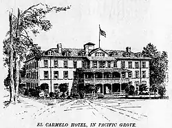 {{cite book}}:|work=ignored (help)CS1 maint: location missing publisher (link) - ^ "Hotel Name is Changed To Be Called Pacific Grove Hotel. Will Help The City. El Carmelo Will Be No More, Has Been a Success". Monterey Daily Cypress and Monterey American. Monterey, California. March 30, 1907. p. 1. Retrieved March 22, 2022.