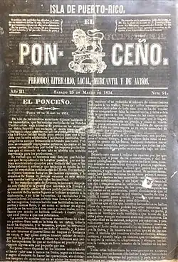 El Ponceño, founded in 1852, was the first newspaper published in Ponce, Puerto Rico.[10] The paper was originally named "El Observador Ponceño" but it was shortened to "El Ponceño".[11]