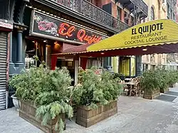 Founded in 1930, El Quijote became the oldest Spanish restaurant in New York City after the 2012 closing of El Faro Restaurant in the West Village.[3] The restaurant began as an outlying affiliate of Little Spain, on 14th Street in Manhattan between Seventh and Eighth Avenues. At one time the eatery was known for having many habitués who were refugees of the Spanish Civil War.