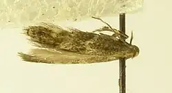 The wingspan is 8–10 millimetres (0.31–0.39 in).[1] The head is grey, face whitish. Forewings in male pale grey irrorated with black, in female blackish except on basal area; a somewhat oblique fascia before middle, a tornal spot, and triangular costal spot somewhat beyond it in male very indistinct, whitish, almost obsolete, in female broader, white, conspicuous. Hindwings are grey. The larva is pale yellowish-grey; head pale brown.[2][3][4]