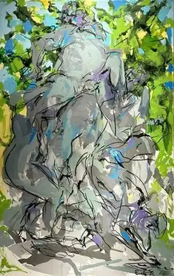 The Bacchus series of paintings and watercolors that Elaine de Kooning generated over seven years began in 1976. She was captivated by a 19th-century sculpture of the Roman god Bacchus, which she saw in the Luxembourg Gardens in Paris. She particularly admired the sculpture’s twisting, dynamic form, which portrays the commotion created by the drunken god and his equally inebriated attendants. It was the first time she ever used acrylic paint.[30][31]