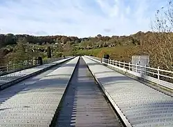 Some crossings over canals and railways have been replaced by buried pipes.[27][26] The line of the buried aqueduct through woodland is marked by a 20 metres (66 ft) "exclusion zone" from which trees are removed.[27]