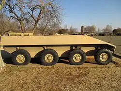 On one occasion an Eland-90 detonated two TM-46s, which sent the vehicle airborne and hurled it about thirty metres away, after which it landed on its turret.[38] Although the three crew members escaped serious injury,[38] incidents like these demonstrated that the Eland simply lacked the mass to absorb the explosive force of an anti-tank mine.[17] For the SADF and the police, the only other viable option was the adoption of armoured personnel carriers with mine-proof hulls that could move quickly on roads with little risk to their passengers even if a mine like the TM-46 was encountered.[46] This would trigger a series of experiments aimed at producing a new class of military vehicle, the mine resistant and ambush protected vehicle (MRAP).[46] From 1974 onward, Elands began to be replaced in their traditional role of convoy escort by specialised mineproofed vehicles.[46]