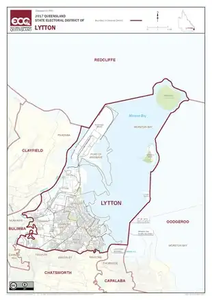 The district is based in the eastern suburbs of Brisbane, to the south of the Brisbane River. It is named for the suburb of Lytton and also includes the suburbs of Hemmant, Lota, Manly and Wynnum, as well as the Port of Brisbane. The electorate was first created for the 1972 election.