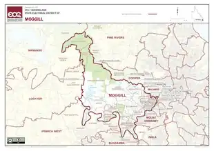 The electoral district of Moggill was created in the 1986 redistribution combining part of the electoral district of Mount Coot-tha with parts of the electoral district of Ipswich West. In 1991, a small portion east of the Centenary Highway was removed.[1]