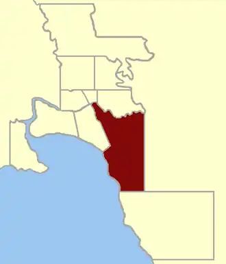 St Kilda was one of the initial districts created in the first Victorian Legislative Assembly, 1856.[1] It included an area south of the Yarra River and the then villages of St Kilda and Elsternwick.[2]