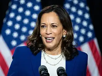 On March 8, 2020, Harris endorsed former vice president Joe Biden.[3] Harris was chosen by Biden to be his running mate on August 11, 2020.[4] Biden and Harris went on to win the 2020 general election. On January 20, 2021, Harris became the first female vice president and the highest-ranking female official in U.S. history, as well as the first African American and Asian American Vice President of the United States.[5] Harris was the presidential nominee of the Democratic Party in the 2024 election following Biden's withdrawal from the race.[6] She lost the general election to Donald Trump.
