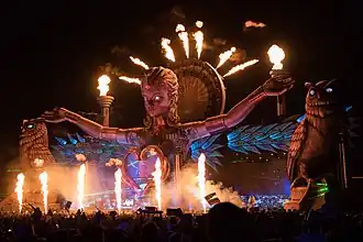 The event features electronic dance producers and DJs, and incorporates a variety of electronic music, including house, techno, drum and bass, and dubstep.[3] In addition to the music, event goers experience three-dimensional superstructures, colorful glow-in-the-dark environments, and LED-lit flora and fauna.[4] There are also interactive art installations throughout EDC, free-roaming carnival performers, and carnival rides.[4]