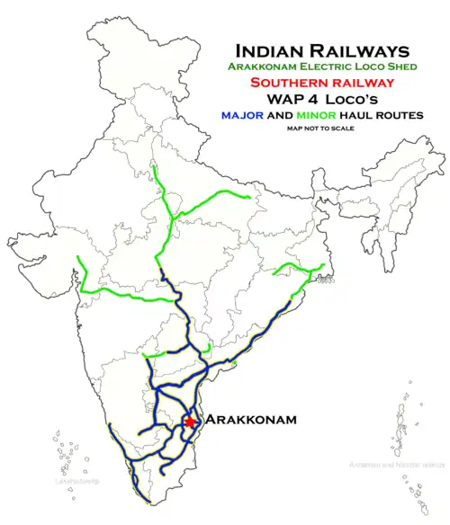 Steam locomotive sheds used to exist at Arrokonam (AJJ) until the late 1970s.[1][2] After Southern Railway set a deadline to eliminate all steam locomotive operations by 1990, a push was given towards establishing electric locomotion as the primary motive power, and the Steam locomotive shed was decommissioned.[3] To meet the needs of exponentially increasing rail traffic on the new continuous broad-gauge lines from Chennai to Kanyakumari and Palakkad with the completion of gauge conversion, the steam shed site was selected by Indian railways for a new electric locomotive shed.[4]