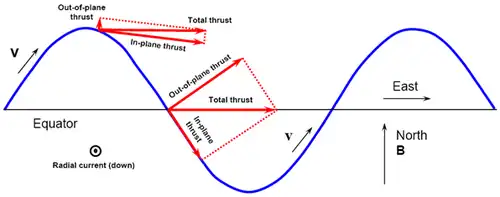 | Electrodynamic power generation | Electrodynamic thrust generation |