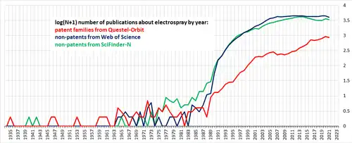The number of publications about electrospray started rising significantly around 1990 (as shown in the figure on the right) when John Fenn (2002 Nobel Prize in Chemistry) and others discovered electrospray ionization for mass spectrometry.