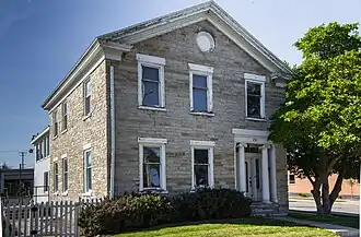 The Turner House is a two-story Greek Revival building constructed of native gray and buff limestone quarried from the bottom of the rapids. The house measures 28 feet by 60 feet. The entryway is framed with Ionic columns and side lights. On the interior, the main stairway is made of red cherry, and incorporates a handrail ending in the carved form of a man's hand as well as a newel post containing a sterling silver inscribed, "G. Colton, Builder."[3]