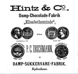 The Elisabethsminde chocolate factory was established by Peter Christian Deichmann (1795-1848) in 1825. It was located at Peblinge Lake, between present day Nørre Søgade and Nansensgade. It changed hands several times. It installed one of the first steam engines in Copenhagen.[1]