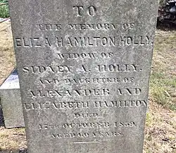 Eliza Hamilton Holly died in Washington, D.C., on October 17, 1859, due to an unknown illness. According to the memoirs of her friend, Marian Gouverneur, she had been sick for at least a month before her death.[16] She and her husband left no descendants.[13] She was buried in Westchester County, New York at Sleepy Hollow Cemetery, where her sister Angelica Hamilton had been buried two years earlier; in 1878, their brother James Alexander Hamilton was also buried there.