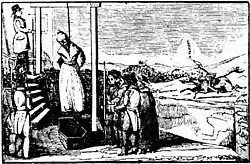 Several old illustrations of Elizabeth Wilson's hanging show a scaffold and gallows, but at that time such structures were not in widespread use. Rather, the condemned were "swung off." They were placed atop a ladder or cart (the latter being the case in Chester); one end of the rope was tied most likely to a convenient tree branch and the other, of course, placed around the victim's neck; the condemned was then pushed from his perch, or the support was quickly pulled from beneath him. Executions in this manner were often protracted, gruesome affairs, resulting in a slow death by asphyxiation rather than a quickly-broken neck, and hanging was considered (as it has been throughout history) one of the most shameful methods of capital punishment.[15][24][25] While the execution of women has always been relatively uncommon, there were many instances in this period of women who were hanged for the murders of their "bastard children."[15]