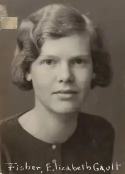 Elizabeth Gault Fisher was born on April 29, 1909, in Baltimore, Maryland. She was the daughter of Anne (née Baylor) and Dr. William A. Fisher, health commissioner of Baltimore.[1][2] She attended the Calvert School, St. Timothy's School, graduating in 1927, and Roland Park Country School, graduating in 1930.[1][3][4] She studied at Cornell University beginning in 1930, and graduating with a Bachelor of Science in 1934, a master's degree and a Ph.D. in entomology in 1938.[1][4] Her dissertation was A Comparative Study of the Male Terminalia of the Mycetophilidae of Nearctic America.[1]