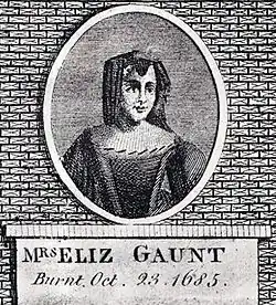 Gaunt was an Anabaptist shopkeeper in London.[1] She and her husband William lived in the parish of St Mary, Whitechapel. They were involved in Whig politics.[2] She was the daughter of Anthony Fothergill of Brownber, Ravenstonedale, and was well known to give shelter to persecuted people, such as victims of religious and political oppression.[1] According to Bishop Burnet, she spent "her life in acts of charity, visiting the gaols and looking after the poor of what persuasion soever they were". She helped one of the participants of the failed Rye House Plot of 1683, James Burton, to escape to Amsterdam. After his arrest in 1685, Burton implicated her as an accomplice in the hope of saving his life. She was in fact not involved in the conspiracy and the trial against her was seen as a show trial. David Hume wrote, "He received a pardon as a recompense for his treachery and she was burnt alive for her charity."[3] She was sentenced to death for treason in the Old Bailey on 19 October 1685.