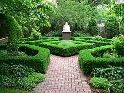 Architect Kenneth Boroson, 1995-6, Elizabethan Club Garden. Engraved under the bust of Shakespeare: "I know a bank where the wild thyme blows, where oxlips and the nodding violet grows, Quite over-canopied with lush woodbine, With sweet musk-roses, and with eglantine..."