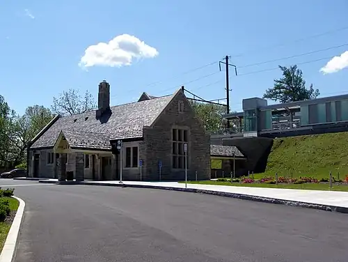 Because of the construction of an embankment at nearby Bainbridge Street, the Pennsylvania Railroad was forced to build a new station at West High Street in 1900.[10] After 15 years, the Pennsylvania replaced the station.[11] The new station was constructed out of Indiana Limestone in a similar style to the nearby Masonic Homes built by the Grand Lodge of Pennsylvania. On July 4, 1915, the Liberty Bell made a stop at the station while being transported to the Panama–Pacific International Exposition in San Francisco, California.[12] The Pennsylvania began electrifying its line between Philadelphia and Harrisburg in 1937, a task which was completed on January 15, 1938.[13] In 1977, the deteriorating station building was closed.[14] Prior to the introduction of the Keystone Service in 1981, the Elizabethtown station was served by the Big Apple, the Silverliner Service, and the Keystone.[15] From 1991 to 1995, the Atlantic City Express served the station on weekends.[16][17] The Three Rivers made stops in Elizabethtown in 1995 and 1996.[18][19]