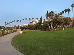 Scripps Memorial Park was inspired by the late nineteenth-century American picturesque park movement, borrowed from English landscape traditions.[4] Curving paths through the park mirror organic patterns found in nature and lead walkers along the edge of the coastal bluff. The lawn, sloping downward to the cliff face, is encircled by a concrete path lined with benches.