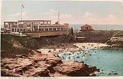 In 1906, a larger bathhouse was built with a bowling alley, café, dressing rooms, and lockers. A wooden stairway provided access to the cove. When this structure became dilapidated in the 1920s, residents defeated a proposal to build a second one.[13] In the early 1930s, they shot down a proposal to build a breakwater and yacht harbor around La Jolla Cove.[14]