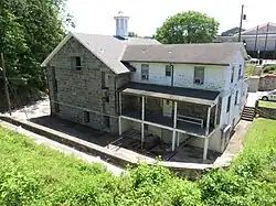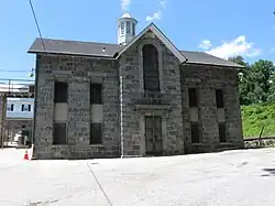 In 1878, Howard County opened its first permanent jail facility on Emory road in Ellicott City. The granite building was designed to house twelve inmates. The building is an example of Romanesque revival architecture. It was named "Willow Grove" or Emory Jail.[3] The 1878 commissioners' names are inscribed in the stone (Samuel Brown, Jerome C. Berry, and Willam Rowles).[4] Eight cells were originally constructed, including "dark cells" which held condemned prisoners awaiting morning executions.[5]