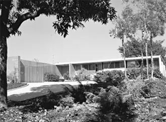 The home was located at 400 North Carmelina Avenue, near Sunset Boulevard in the Brentwood neighborhood.[11][12] The Los Angeles Conservancy stated that at the time of demolition, the home was "highly intact and a noteworthy example of modernist design from this era."[2] The façade of the structure featured recessed glazing creating a space, as described by Progressive Architecture as "completely open to the lawn and vistas to the rear." Arts & Architecture magazine described the façade as "four ten-foot glass doors, each sliding, open (to the) living-dining area to the terrace of textured concrete which leads to the plant garden. The bedrooms alternate on either side of the spine.[1]