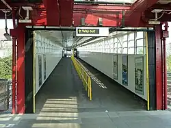 The Art Deco ticket office is located above platform level, to which it is connected by a long sloping walkway.[30] There is step-free access from the platform to the street.[2] The design is similar to stations at Dagenham Heathway and Upney, although the building has greater use of reinforced concrete which has created a more distinctive design with a curved roof overhang.[17]