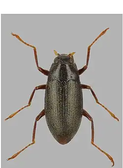 Adults reach a length of 2.21–2.67 mm (males) and 2.21–2.89 mm (females). Their body is elongate oval and black, except for the mouthparts, antennae, tarsi and trochanters which are reddish-brown. The remaining parts of the legs are brown.[1][2]