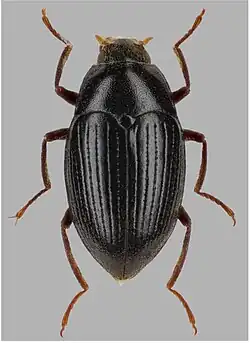 Adults reach a length of 2.92–3.27 mm (males) and 3.58 mm (females). Their body is oval, moderately convex and integument black. The mouthparts, antennae, and tarsi are reddish brown and the remaining parts of the legs are brown.