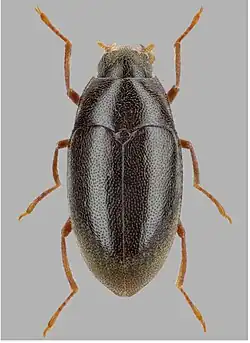 Adults reach a length of 2.55–2.68 mm (males) and 2.65–2.95 mm (females). Their body is oval, strongly convex dorsally and integument brown to black, while the trochanters, tarsi, antennae, and mouthparts are paler.