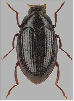 The species name is Latin superficialis (meaning superficial) and refers to the distinct, but weakly impressed, longitudinal rows of large elytral punctures.[1]