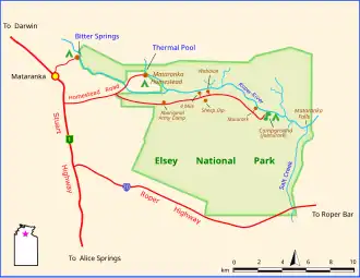 Elsey is a national park in the Northern Territory of Australia,[3] extending from 2 km to 19 km east of Mataranka and 378 km southeast of Darwin.[4]