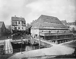 In the 12th century[7] the Elstermühlgraben was built to regulate the regular spring floods and to operate mills. Some of these were still preserved and in use until the late 19th century (such as the Angermühle, which was demolished in 1878). A settlement on the banks of the Mühlgraben has been documented since the early 13th century. Until Leipzig's strong expansion around 1850, the canal lay completely outside the city proper. As part of the expansion of the Ranstädter Steinweg, the Mühlgraben was arched over in this area in 1878. In the 20th century, Leipzig's rivers became very polluted by the discharge of sewage and their inner-city courses were largely arched over or piped, as was the case with the Elstermühlgraben around 1960. Since the reunification of Germany in 1990, the water quality has noticeably improved, which is why the previously almost 1,000 m (3,281 ft) long underground section of the Mühlgraben has been gradually reopened since 2004 for renaturation and to improve the quality of living and leisure as well as flood protection.