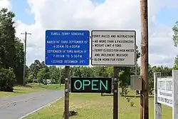 The ferry travels a distance of 110 yards,[4] shore to shore, with a travel time of five minutes,[5] has a maximum capacity of two cars or four tons by weight, operates without a toll, and operates daily, providing service from 6 am to 6 pm, Spring and Summer, and from sunrise to sunset in the Winter and Fall.[6] There is no ferry service on Christmas Day or on days of high water or storm conditions. Vehicles arriving on the opposite shore from the ferry, summon the ferry by blowing their horn. Ferry traffic averages 60 to 80 vehicles daily.