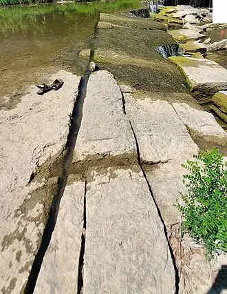 While the Elmont Limestone member is generally less than 3 feet thick (1 meter), it can be as thick as 15 feet (5 meters)[3] and as thin as 12 inches. As thin as that, it is particularly resistant and forms multiple waterfalls within a few miles along Deep Creek in southern Riley County, including Pillsbury Crossing.[6][7] At Pillsbury Crossing, the Elmont Limestone is seen with parallel joints (pictured); and where not thickly covered with algae, the surface shows curious parallelogram patterns.