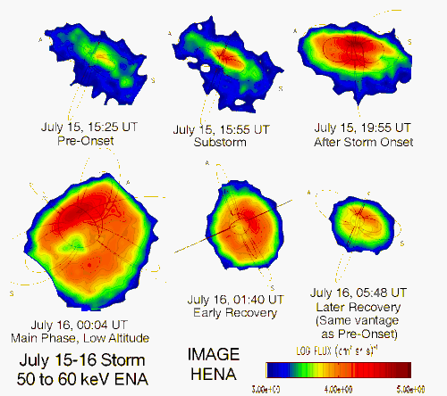 The new millennium saw ENA Imaging coming into its own. Extensive and detailed observations of the Earth's magnetosphere were made with three ENA instruments aboard the NASA IMAGE Mission from 2000 – 2005.[5] In July 2000, a set of ENA images of the Earth's ring current were made during a geomagnetic storm. (See image at the top of the page.) The storm was triggered by a fast coronal mass ejection that erupted from the Sun on July 14, 2000 and arrived at Earth the next day.